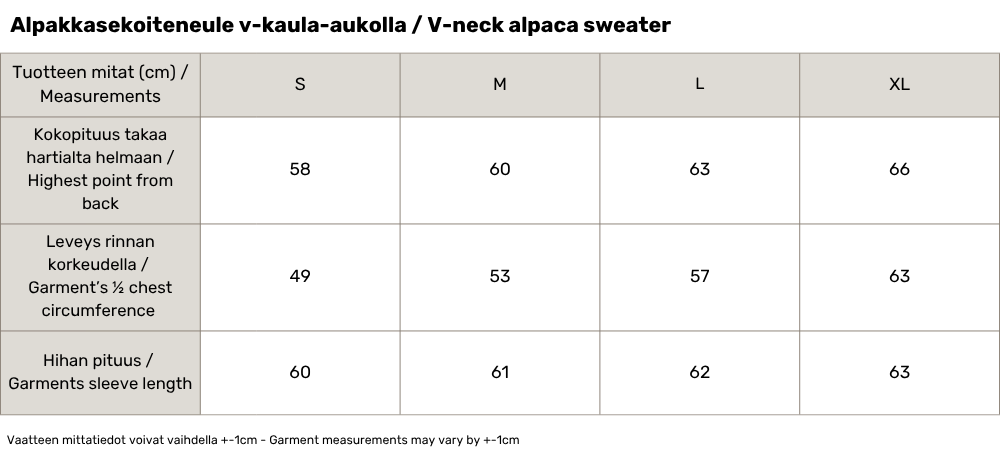 - Materiaali: 79% Alpakka, 19% Nylon, 2% Spandex
