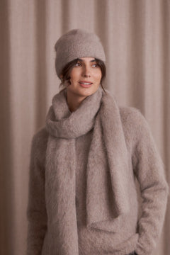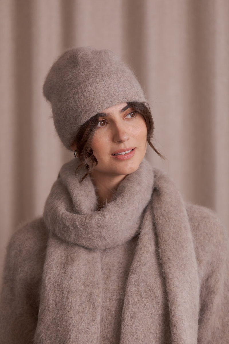 Pörröinen Ally alpakkapipo on valmistettu ylellisen pehmeästä ja lämpimästä alpakkasekoitteesta, joka tuntuu miellyttävältä ihoa vasten. Leveä joustinneulosresori antaa pipolle ryhdikkään ilmeen ja sen korkeutta voi säätää helposti resoria kääntämällä. Monikäyttöinen pipo sopii harmonisesti yhteen alpakkasekoitehuivien kanssa, luoden yhtenäisen ja tyylikkään kokonaisuuden.