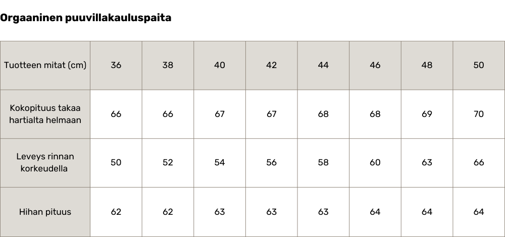 Malli on 177 cm pitkä ja hänellä on yllään koko 36. Suosittelemme ottamaan yhden isomman koon kuin normaalisti.True to size