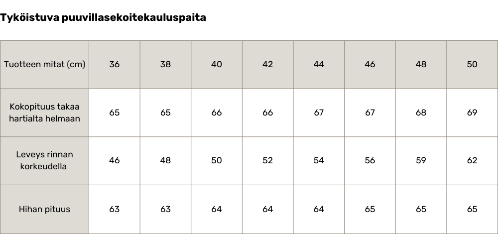Malli on 177 cm pitkä ja hänellä on yllään koko 36. Suosittelemme ottamaan yhden isomman koon kuin normaalisti.True to size