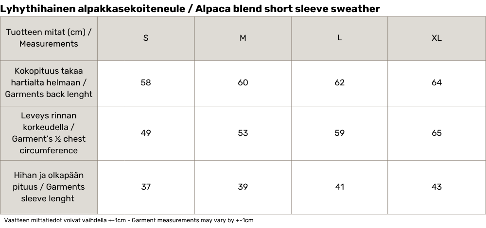 Alpakkasekoiteneuleessa on rento malli, pyöreä pääntie sekä kapeat neuloskäänteet hihansuissa ja helmassa. Ariel-neuleessa yhdistyvät yksinkertainen eleganssi ja ajaton mukavuus. Alpakanvillan pehmeys tekee neuleesta helpon valinnan arkeen ja vapaa-aikaan. Lyhythihainen malli tekee tästä neuleesta erityisen monikäyttöisen; se on helppo yhdistää erilaisiin asukokonaisuuksiin, olipa kyseessä rento arkipäivä tai hieman juhlavampi tilaisuus.