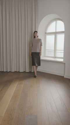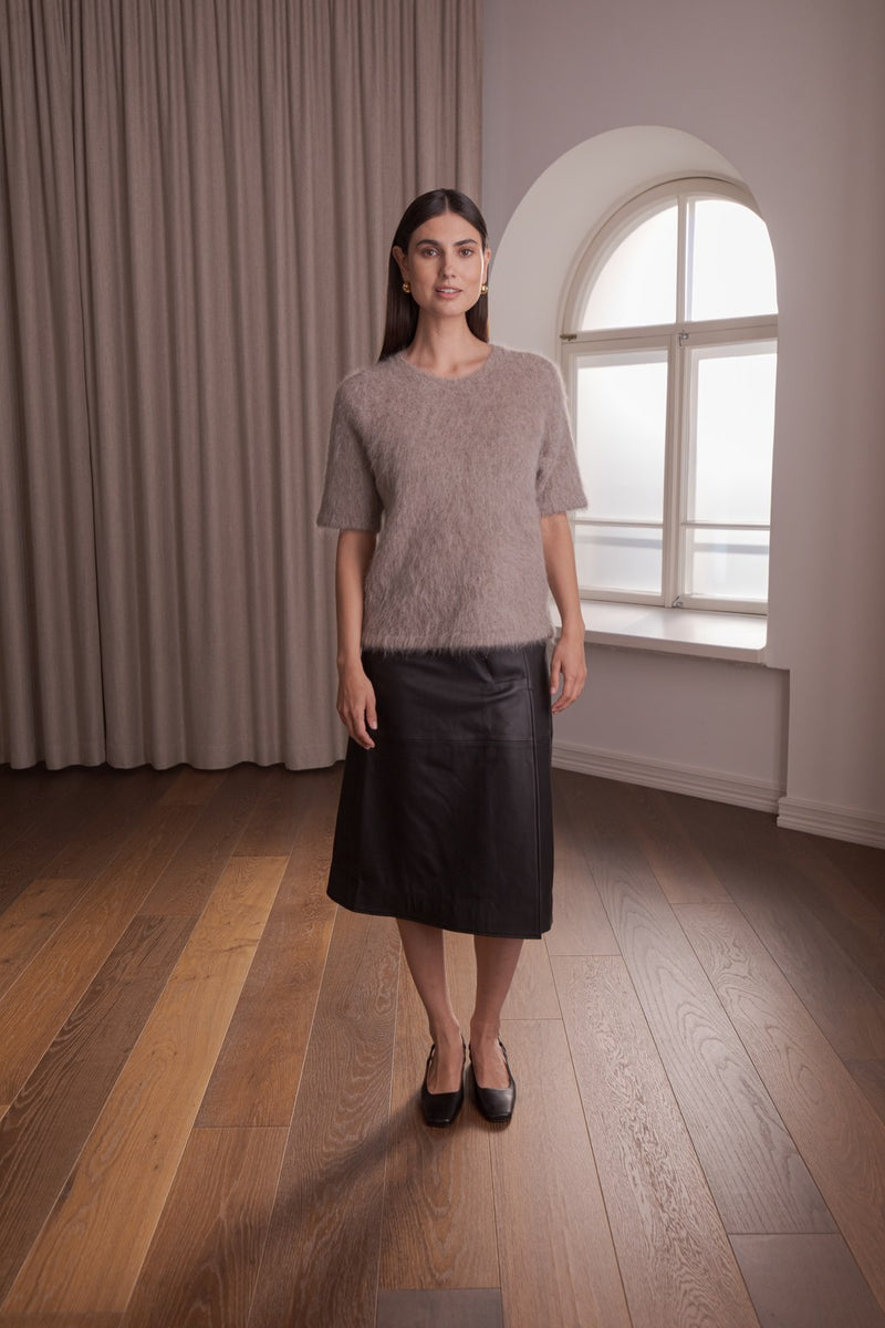 Alpakkasekoiteneuleessa on rento malli, pyöreä pääntie sekä kapeat neuloskäänteet hihansuissa ja helmassa. Neuleessa yhdistyvät yksinkertainen eleganssi ja ajaton mukavuus. Alpakanvillan pehmeys tekee neuleesta helpon valinnan arkeen ja vapaa-aikaan. Lyhythihainen malli tekee tästä neuleesta erityisen monikäyttöisen; se on helppo yhdistää erilaisiin asukokonaisuuksiin, olipa kyseessä rento arkipäivä tai hieman juhlavampi tilaisuus.