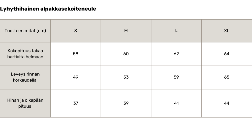 Alpakkasekoiteneuleessa on rento malli, pyöreä pääntie sekä kapeat neuloskäänteet hihansuissa ja helmassa. Neuleessa yhdistyvät yksinkertainen eleganssi ja ajaton mukavuus. Alpakanvillan pehmeys tekee neuleesta helpon valinnan arkeen ja vapaa-aikaan. Lyhythihainen malli tekee tästä neuleesta erityisen monikäyttöisen; se on helppo yhdistää erilaisiin asukokonaisuuksiin, olipa kyseessä rento arkipäivä tai hieman juhlavampi tilaisuus.