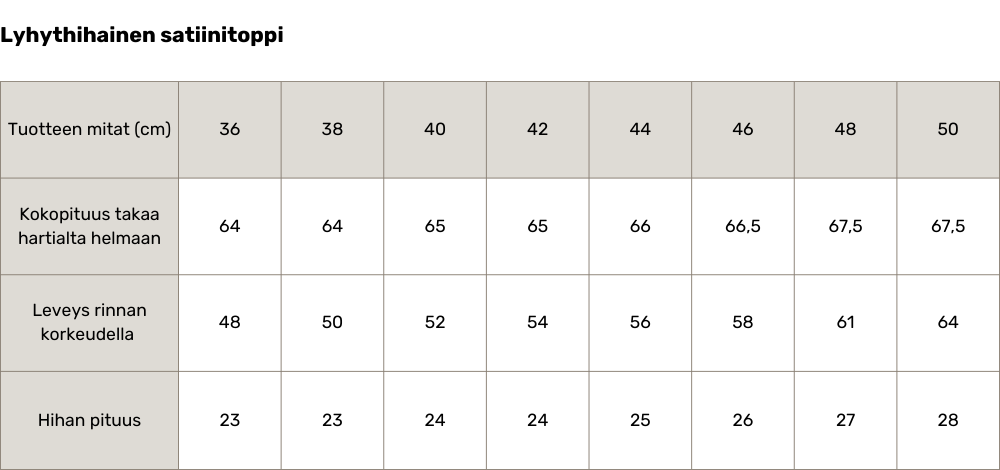 Lyhythihaisessa satiinipaidassa on normaali suora leikkaus ja istutettu hartialinja antavat istuvuutta ja ryhtiä. Rintamuotolaskokset lisäävät istuvuutta, ja sivuhalkiot pyöristetyillä kulmilla sekä hieman pidempi takaosa antavat paidalle modernin ilmeen. Pyöreän kaula-aukon takana on nappikiinnitys kauniina yksityiskohtana.