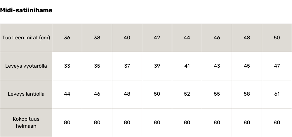 Elegantti satiinihame laskeutuu kauniisti midi-mittaan. Se on valmistettu laadukkaasta, Japanissa kehitetystä triasetaatti-muuntokuidusta, joka antaa kankaalle silkkimäisen kiillon. Hame on ryhdikäs mutta kevyt päällä. Hengittävä triasetaatti tekee hameesta erityisen helppohoitoisen – materiaali säilyttää siistin ilmeensä rypistymättä.