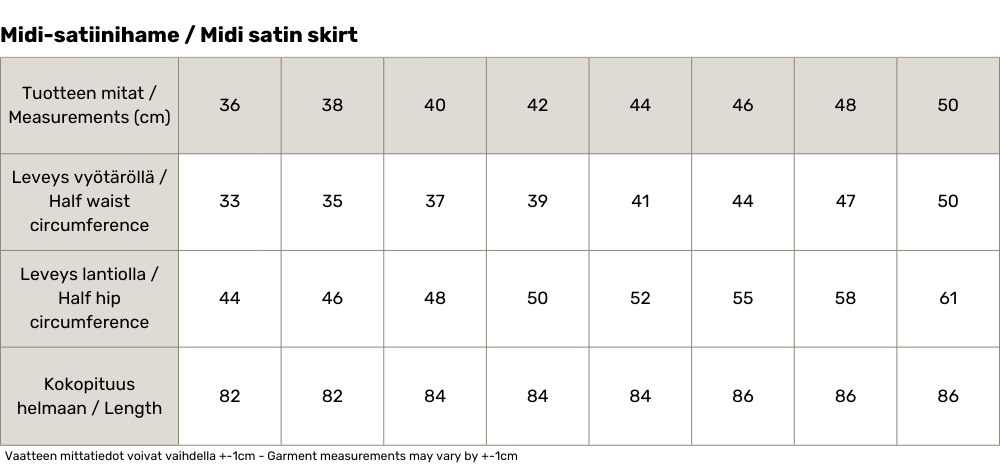 Elegantti midi-satiinihame soveltuu niin toimistotyyliin kuin iltatilaisuuksiin. Tianna-hame on valmistettu laadukkaasta, Japanissa kehitetystä triasetaatti-muuntokuidusta, joka antaa kankaalle silkkimäisen kiillon. Hame on ryhdikäs mutta kevyt päällä. Hengittävä triasetaatti tekee hameesta erityisen helppohoitoisen – materiaali säilyttää siistin ilmeensä rypistymättä.