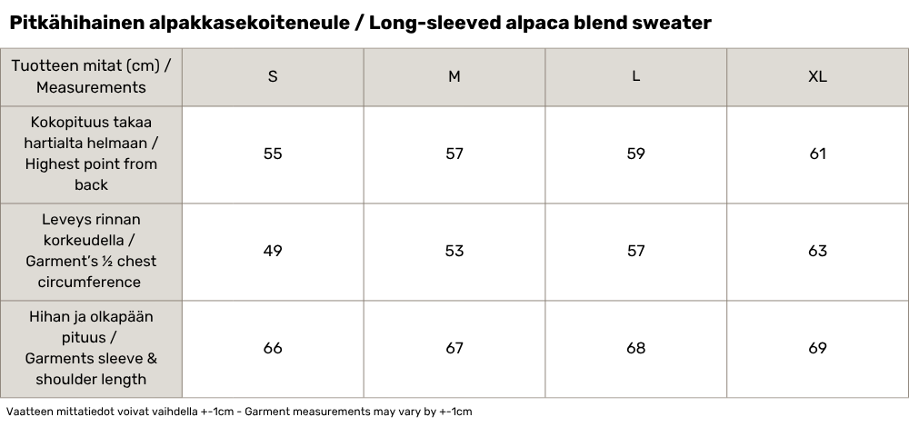 • Ennen kuin otat neuleen käyttöön, suosittelemme sen höyryttämistä höyryttimellä tai höyrysilitysraudalla, jotta neuleesta tulee pehmeä ja ilmava. Harjaa neule tämän jälkeen tasolla myötäkarvaan vaateharjalla, mikä auttaa pitämään pinnan huoliteltuna. Säännöllinen harjaus ja tuuletus raikastavat neuletta ja vähentävät pesutarvetta. Jos pesu on tarpeen, suositamme kuivapesua tai hellää käsinpesua luonnonkuiduille sopivalla pesuaineella. Säilytä neule viikattuna, jotta se säilyy kauniina pitkään.