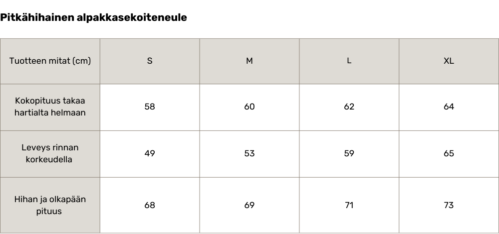 Pitkähihaisessa alpakkasekoiteneuleessa on rento istuvuus ja pyöreä pääntie. Erinomainen lämmöneristys, pehmeys ja pörröisyys tekevät siitä erityisen miellyttävän ihoa vasten.