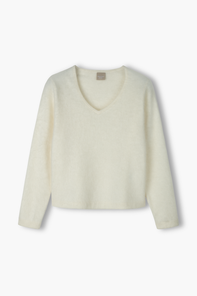 Pitkähihainen harjattu kashmirneule V-kaula-aukolla, Cream
