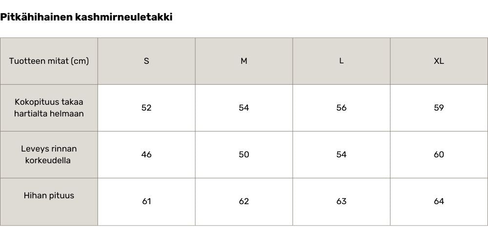 Kashmirneuletakki on valmistettu 100 % kashmirista, joka tuntuu ylellisen pehmeältä ja näyttää hienostuneelta. Etureunassa on kuusi siroa kangaspäällysteistä nappia, jotka tuovat viimeistellyn ilmeen. Istutettu hihalinja antaa neuletakille ryhdikkään, jakkumaisen siluetin. Kapeat neuloskäännökset hihansuissa ja helmassa sekä suora, hieman lyhyempi helma tekevät leikkauksesta modernin ja selkeän. Avara, pyöreä pääntie laskeutuu kauniisti ja tekee neuletakista helposti yhdisteltävän erilaisten yläosien ja asujen kanssa.
