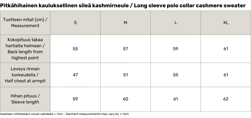 Pitkähihaisen Katye-kashmirneuleen ilme rakentuu klassisen kauluksen ja syvän V-pääntien ympärille. Leveät reunukset korostavat kauniisti pääntietä ja tuovat ryhdikkyyttä kokonaisuuteen. Istutetut hihat antavat neuleelle pehmeän, hyvin istuvan linjan. Hihansuut ja helma on viimeistelty kapeilla neulekäännöksillä, jotka pitävät muodon selkeänä ja ajattomana. Sileä kashmirneulos tekee neuleesta miellyttävän ja monikäyttöisen, siis täydellisen valinnan niin rentoon arkeen kuin harkittuihin asuihin.
