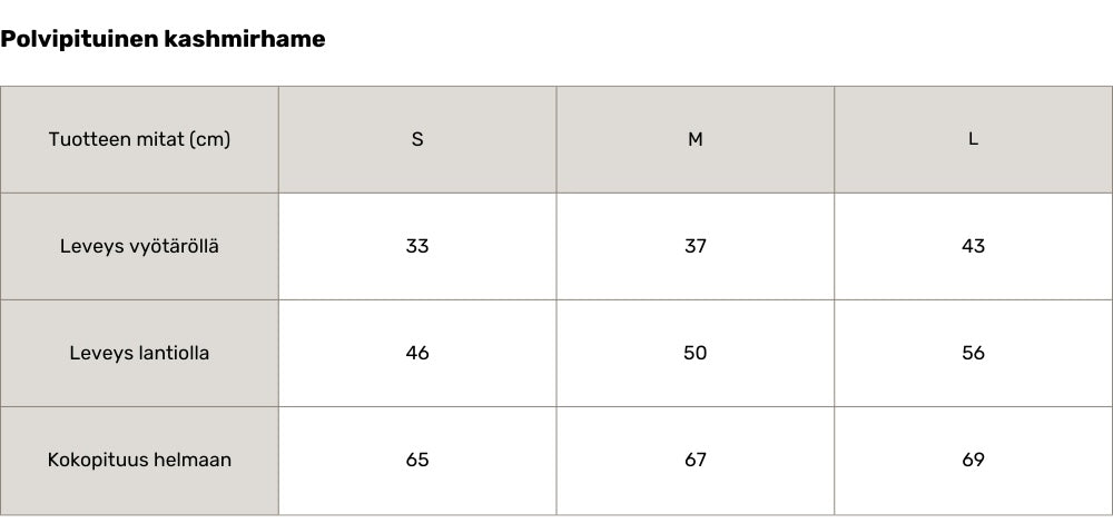 Monikäyttöinen Kaia-hame sopii monenlaisiin asukokonaisuuksiin. Yhdistä esimerkiksi samansävyisen kashmirneuletakin tai valkoisen paitapuseron kanssa. Huolellisella hoidolla hame säilyttää muotonsa ja pysyy kauniina pitkään.