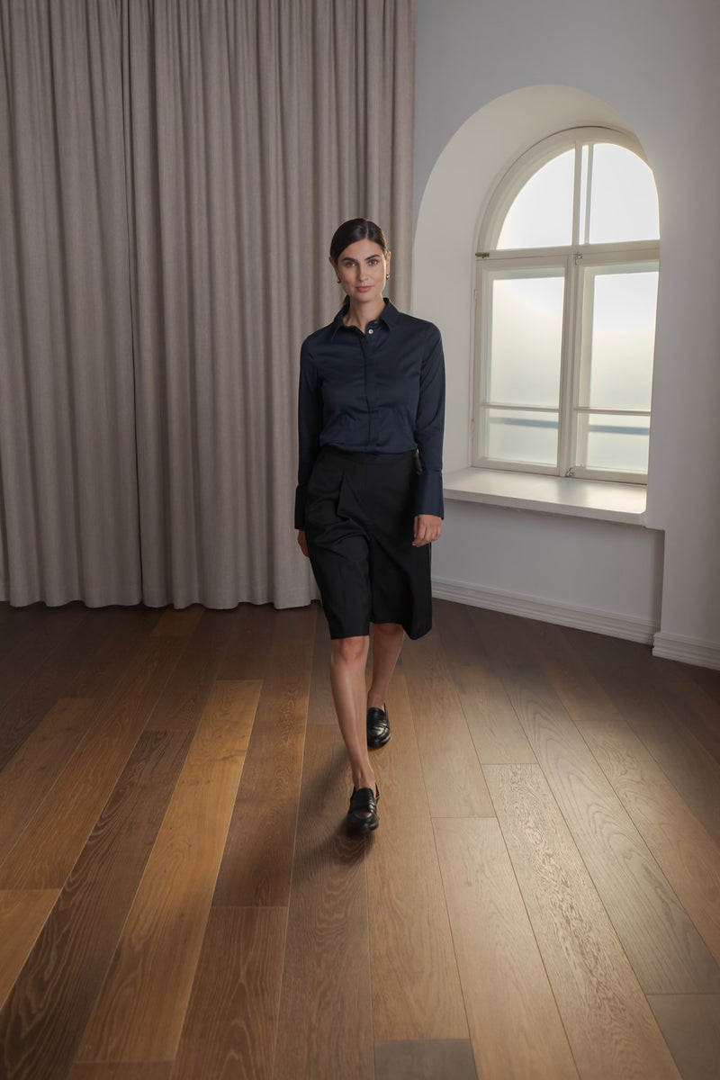 Tyköistuvan leikkauksen ja huolellisesti suunniteltujen rintalaskosten ansiosta kauluspaita laskeutuu kauniisti vartaloa myötäillen ja sopii erinomaisesti myös bleiserin alle. Ajattoman tyylikästä ilmettä täydentävät leveät, käännettävät hihansuut ja hillitty piilonappilista.