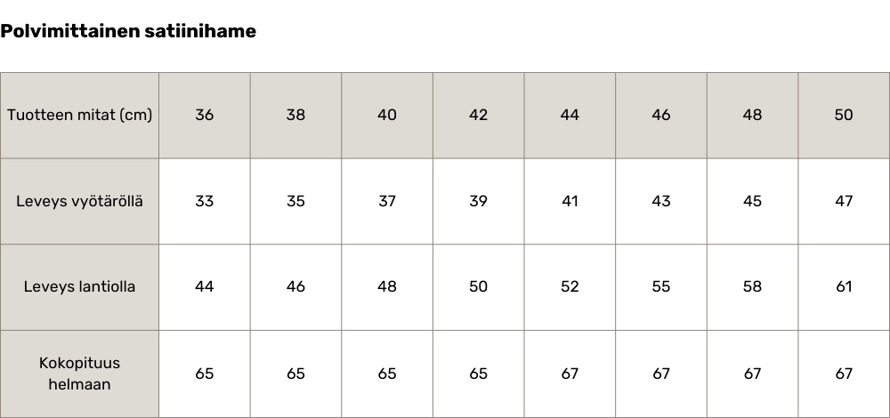 Kapealinjainen polvipituinen satiinihame on valmistettu laadukkaasta, Japanissa kehitetystä triasetaatti-muuntokuidusta, joka antaa kankaalle silkkimäisen kiillon. Kestävä ja helppohoitoinen materiaali säilyttää siistin ilmeensä rypistymättä ja tuntuu pehmeältä ihoa vasten.